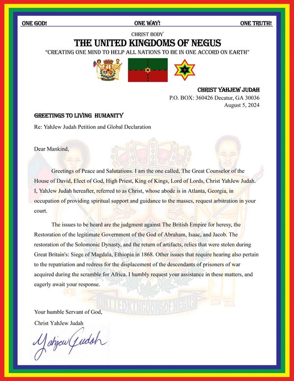 We proclaim that the time has come for us to reclaim our narrative, our resources, and our rightful place on the global stage. The United Kingdom of Negus seeks to replace despair with hope, division with unity, and oppression with empowerment. As we embark on this revolutionary path, we invite you to join us in our quest for greater social justice and equality. Let us rise to the occasion and uphold the principles of unity, self-determination, and empowerment. It is time to reclaim our destiny and usher in a new era of hope and prosperity for Africa and the African diaspora.